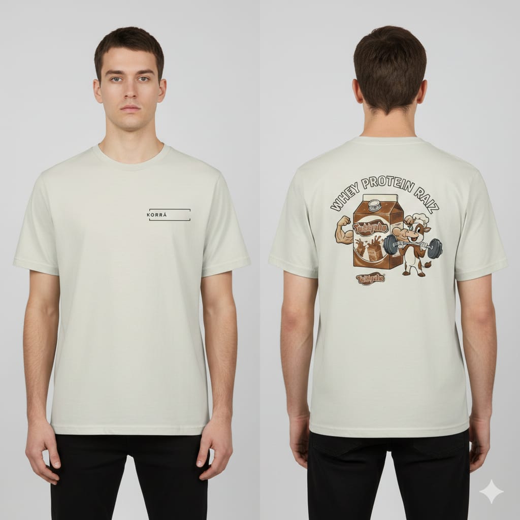O Equilíbrio entre Estilo e Conforto Na frente, o minimalismo da Körrä garante um visual limpo e versátil. Nas costas, a estampa exclusiva "Whey Protein Raiz" traz a autenticidade de quem leva o lifestyle a sério, mas não perde a descontração.
