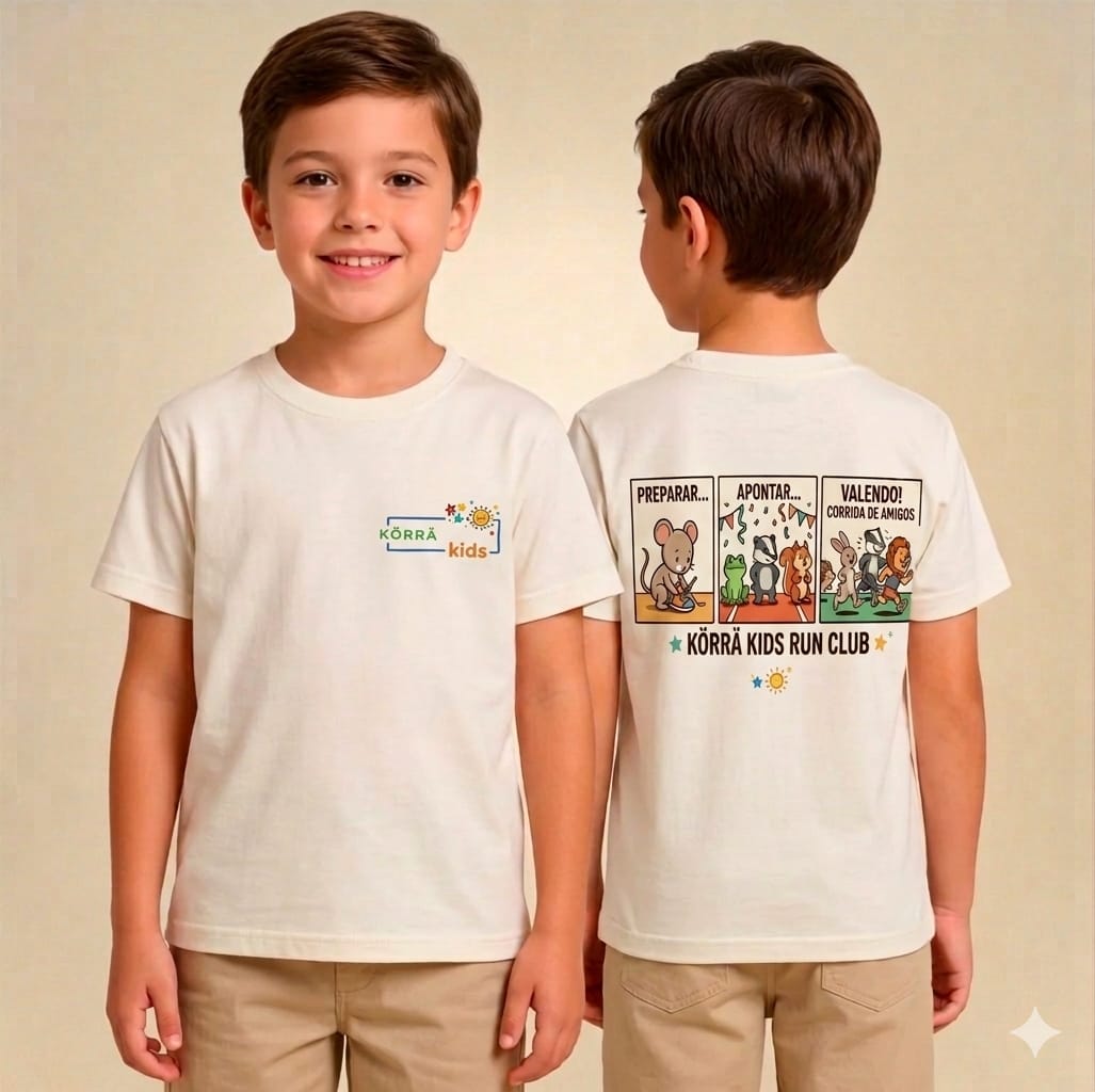 O Equilíbrio entre Estilo e Conforto Na frente, o minimalismo da Körrä garante um visual limpo e versátil. Nas costas, a estampa exclusiva "Körrä Kids Run Club" traz a autenticidade de quem leva o lifestyle a sério, mas não perde a descontração.